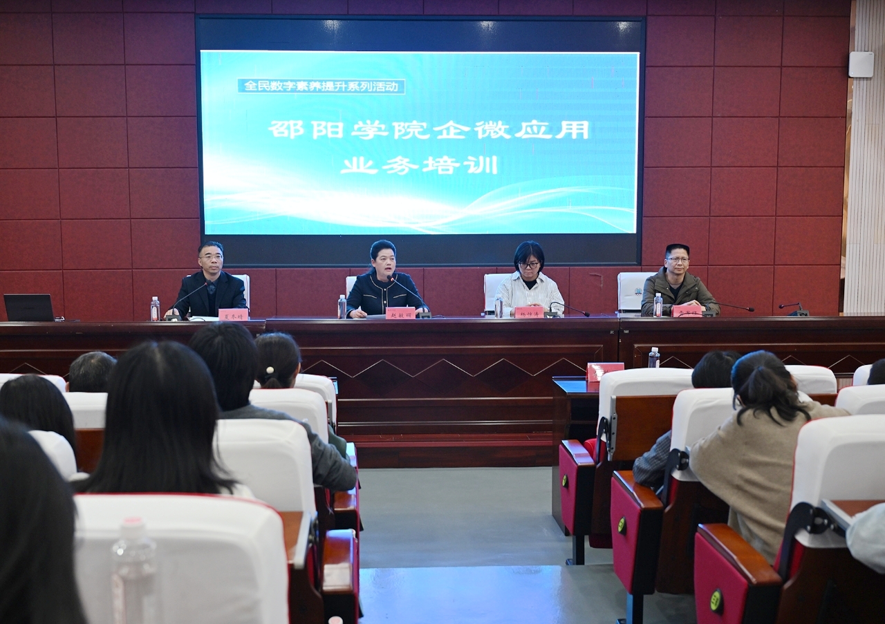 10月28日下午,我校于七里坪校区润德楼报告厅举办全民数字素养提升系列活动之邵阳学院企微应用业务大培训。校党委副书记赵敏丽出席,信息与网络中心主任夏冬晴主持,各部门单位信息员、二级学院学工秘书、研究生团总支副书记、研究生学生会主席、二级学院团总支学生副书记、学生会轮值主席、信息与网络中心全体人员共计117人参加培训。
