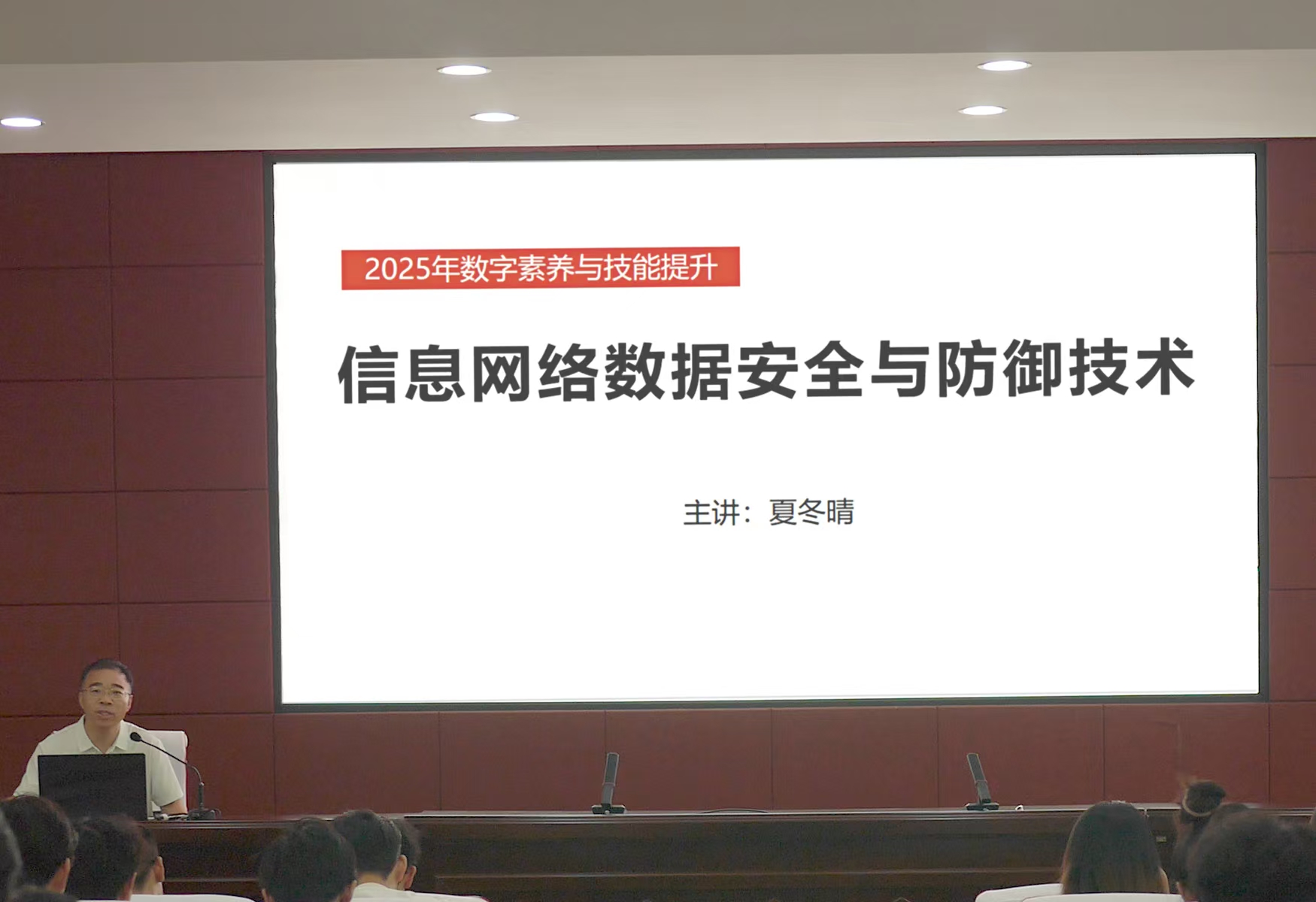 在宣讲培训中,信息与网络中心主任夏冬晴围绕网络安全法律法规、社会形势、典型事件、技术防护、个人信息保护等内容进行了系统阐述。他首先向同学们传达学习了习近平总书记关于网络安全和信息化工作的重要论述和重要指示精神。