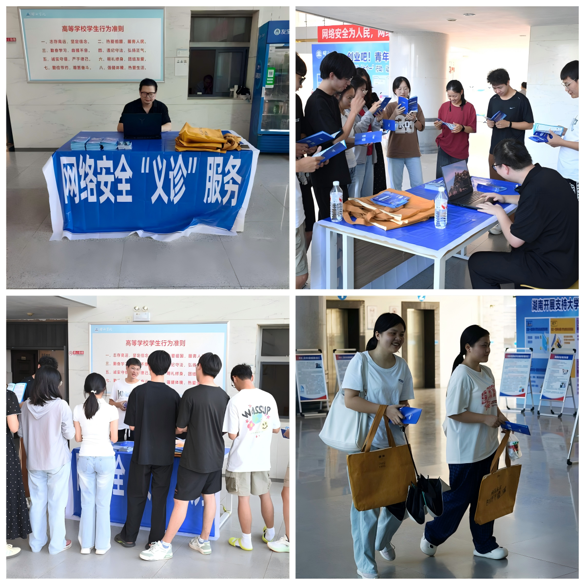 在明德楼大厅创设网络安全“义诊”服务站,由技术专家和志愿者在校园内布置展台,通过搭建模拟场景开展网络信息安全演练,提供免费的手机、电脑安全检测、清理恶意软件、设置安全密码等服务。活动共接待学生近2000人次,发放宣传资料700余份,并为58名师生的设备提供了安全检测服务。