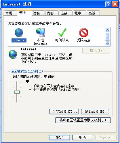 在windows xp操作系统中, Internet区域的自定义安全级别不能设置为“中”以下。