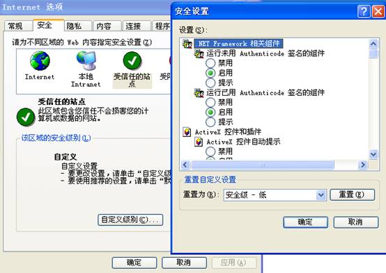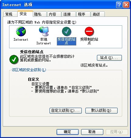 图片上传失败由于windows操作系统默认的安全设置阻止了自动安装此控件。如果直接修改系统的安全级别为低,虽然可以安装上此控件,但是降低了系统的安全级别,上网的时候容易中毒,这是不可取的办法。比较好而安全的方法是通过将后台网址加为受信任的网站,然后调整受信任的网站的安全级别为低。具体步骤如下: