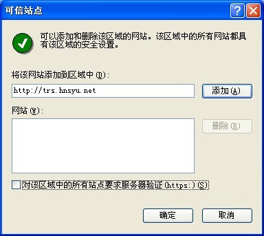 点击“站点”在弹出的“可信站点窗体”中添加TRS后台地址http://trs.hnsyu.net/后点击添加。注意:要把https验证前面的勾去掉。