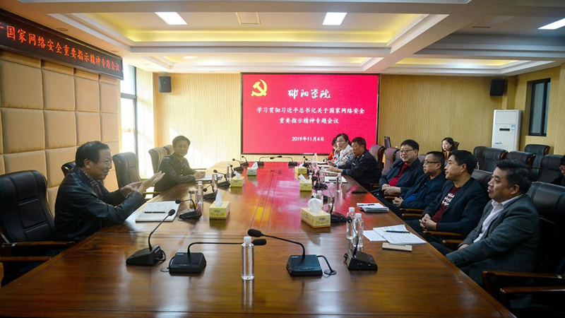 11月4日,我校在七里坪校区一办公楼319会议室召开学习贯彻习近平总书记关于国家网络安全重要指示精神专题会议。校党委副书记陆步诗出席会议并讲话,会议由校党委委员、宣传统战部部长王玉林主持。学工部、团委、网络信息中心、保卫处、教务处主要负责人以及宣传部全体人员参加了会议。