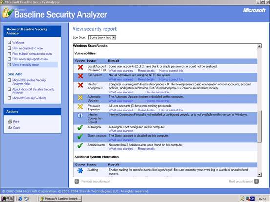 蓝色的“*”图标表示该项目虽然通过了检测但可以进行优化,或者是由于某种原因MBSA跳过了其中的某项检测。白色的“i”图标表示该项目虽然没有通过检测,但问题不很严重,只要进行简单的修改即可。