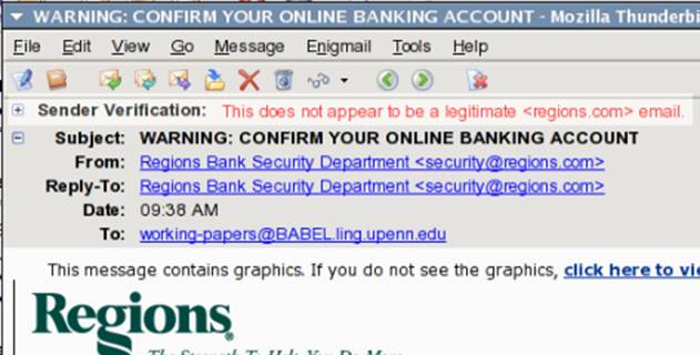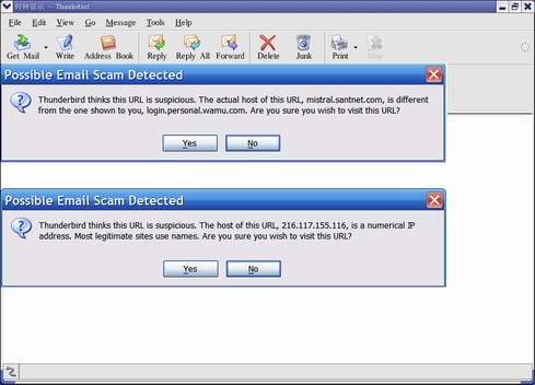 首先建议您将电子邮件软件雷鸟(Thunderbird)到1.1以上,在雷鸟 1.1 版本中实现的新功能包括实现了防止网钓(phishing)攻击警告系统。在新的Thunderbird 功能里,当使用者点选电子邮件里疑似网钓的URL (网址)时,侦测器会在网页打开之前以对话框提醒使用者,Gemal 写道。当网址内有数字型的IP位址而不是用域名名(domain name),或者URL 和文字链结里所显示的网络地址不一样时,侦测器就会启动。见面见图2。