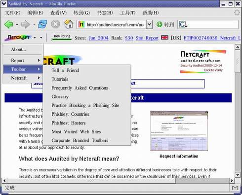 2004年互联网服务厂商Netcraft已经发布了它自己的火狐安全工具插件。这款插件能够帮助Firefox 用户免受钓鱼式欺诈攻击。Netcraft Toolbar能够封杀由其他用户报告的钓鱼式欺诈网站。Netcraft去年12月份发布了的Netcraft Toolbar 目前,被发现和封杀的钓鱼式欺诈攻击网站达到了7000多个。