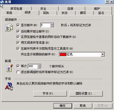 许多恶意邮件都是通过HTML代码达到其不可告人的目的,因此如果你以纯文本方式阅读这些邮件就会让它们无计可施。在Outlook 2003中,打开“工具->选项->设置->电子邮件选项”,选中“以纯文本方式显示所有电子邮件”复选框。在Outlook Express 6种,打开“工具->选项->阅读”,选中“明文阅读所有信息”复选框。见图8。