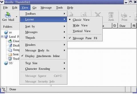许多网络钓鱼邮件只需要在电子邮件收发程序的预览面板中显示就能侵入你的计算机。因此我们建议用户关闭收件箱的预览面板。在Mozilla 雷鸟中,打开“Layout ” ->,清除““Messages pane”复选框(或者使用“F8”快捷键关闭预览面板),见图4。
