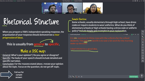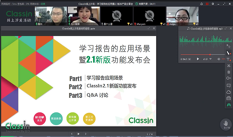 To Make a Collective Report---小组成果汇报,教师邀请每一组的学生代表进行小组分组讨论的成果汇报,达到师生相互启发、教学相长、协作学习的目的。此时,小组的学生代表在教师的授权下可以将自己的摄像头的视频和音频共享给所有人。