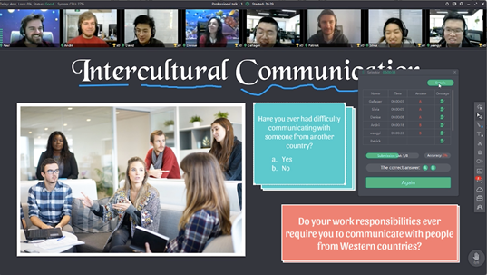 IceBreak---破冰,教师可以通过座位席的与会者列表窗格,了解学生的姓名和参与情况。师生可以通过“文字聊天”窗格打招呼,互相问候和自我介绍,通过“摄像头”窗格,师生互相可以获取直观印象和视频动态,通过“投票”窗格师生可以进行专业知识的调查互动和趣味问答测试。在课程内容教学正式开始前,利用上述功能,开展“破冰”活动,十分有利于师生的快速了解,为接下来的教学活动建立和谐的情感基础。